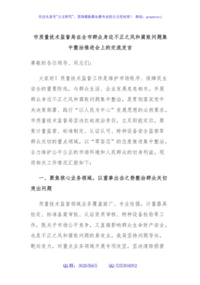/ 市质量技术监督局在全市群众身边不正之风和腐败问题集中整治推进会上的交流发言