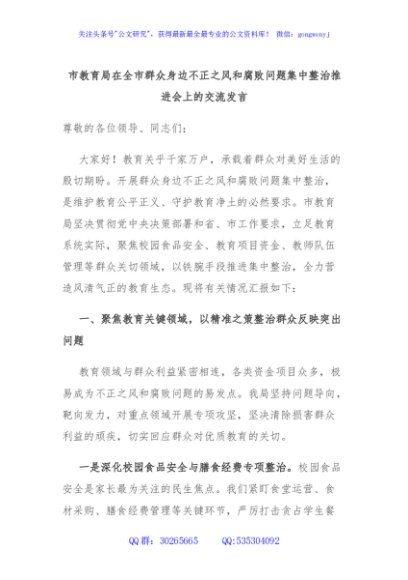 / 市教育局在全市群众身边不正之风和腐败问题集中整治推进会上的交流发言