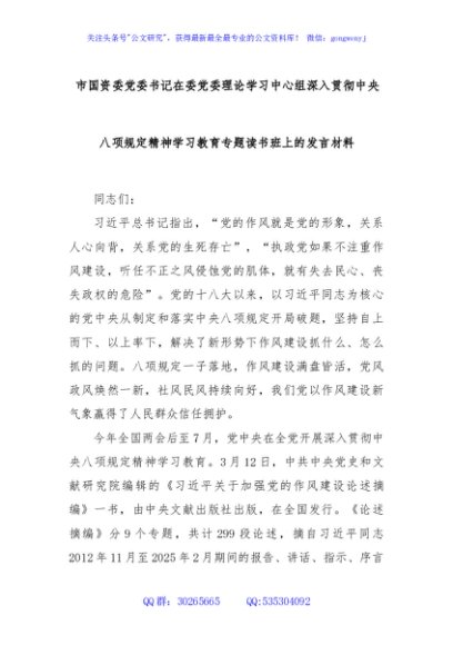 / 市国资委党委书记在委党委理论学习中心组深入贯彻中央八项规定精神学习教育专题读书班上的发言材料