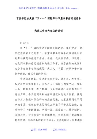 / 市委书记在庆祝“五·一”国际劳动节暨表彰劳动模范和先进工作者大会上的讲话