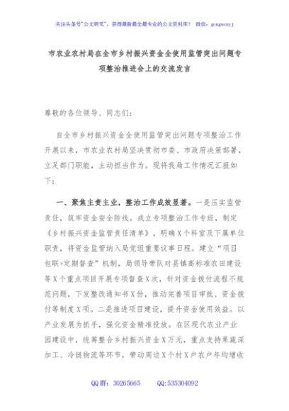 / 市农业农村局在全市乡村振兴资金全使用监管突出问题专项整治推进会上的交流发言