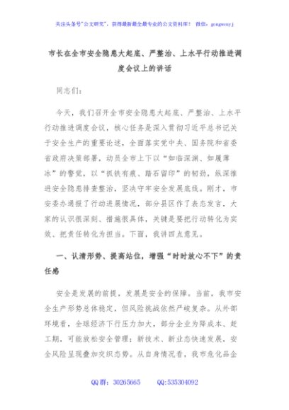 / 市长在全市安全隐患大起底、严整治、上水平行动推进调度会议上的讲话