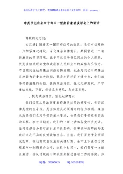 / 市委书记在全市干部五一假期前廉政谈话会上的讲话