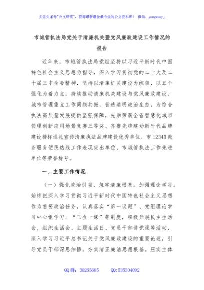 / 市城管执法局党关于清廉机关暨党风廉政建设工作情况的报告