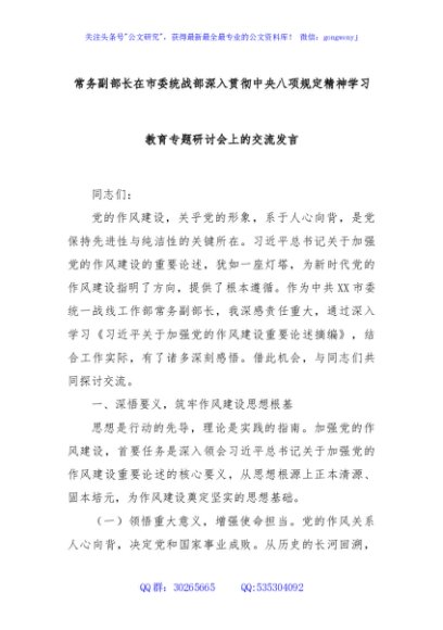 / 常务副部长在市委统战部深入贯彻中央八项规定精神学习教育专题研讨会上的交流发言