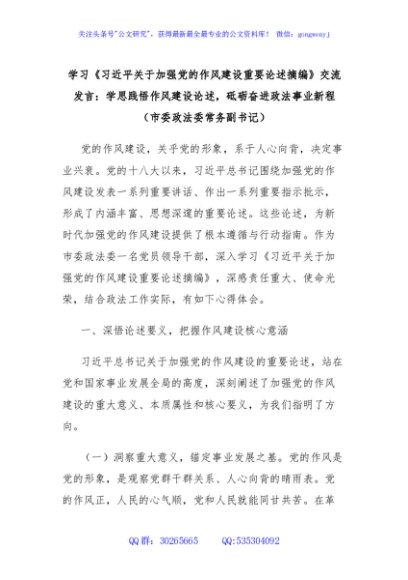 学习《习近平关于加强党的作风建设重要论述摘编》交流发言:学思践悟作风建设论述,砥砺奋进政法事业新程(市委政法委常务副书记)