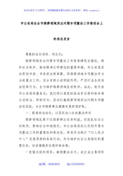 / 市公安局在全市殡葬领域突出问题专项整治工作推进会上的表态发言