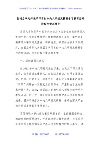 / 街道办事处开展学习贯彻中央八项规定精神学习教育活动阶段性情况报告