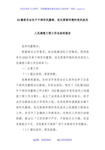 / XX镇委员会关于干部作风整顿、优化营商环境和党风政风人民满意工程工作总结的报告