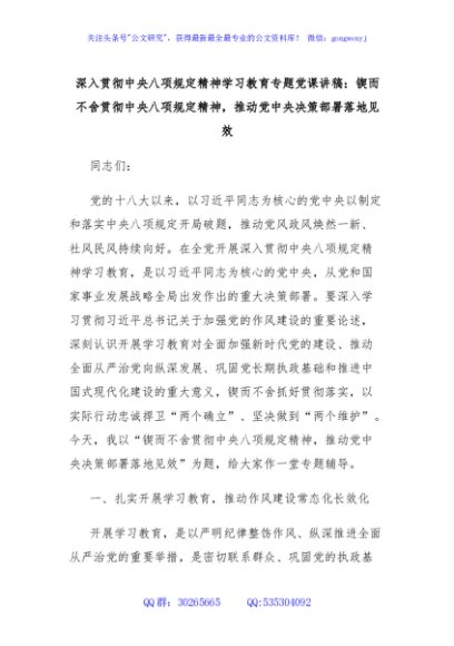 / 深入贯彻中央八项规定精神学习教育专题党课讲稿:锲而不舍贯彻中央八项规定精神,推动党中央决策部署落地见效