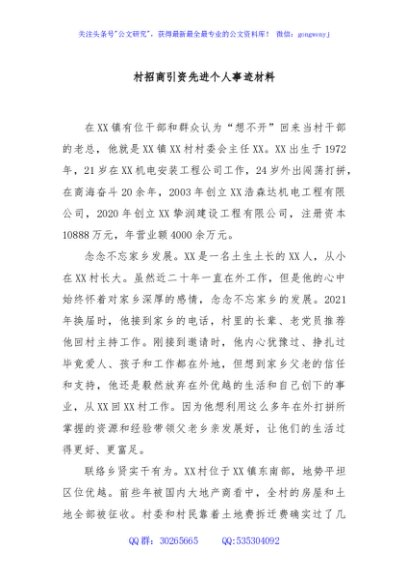 / 村招商引资先进个人事迹材料