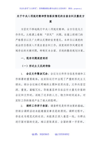 / 关于中央八项规定精神贯彻落实情况的自查自纠及整改方案