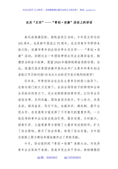 / 在庆“五四”——“青创·安康”活动上的讲话