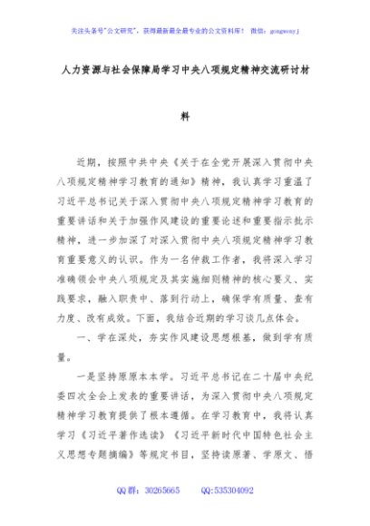 / 人力资源与社会保障局学习中央八项规定精神交流研讨材料