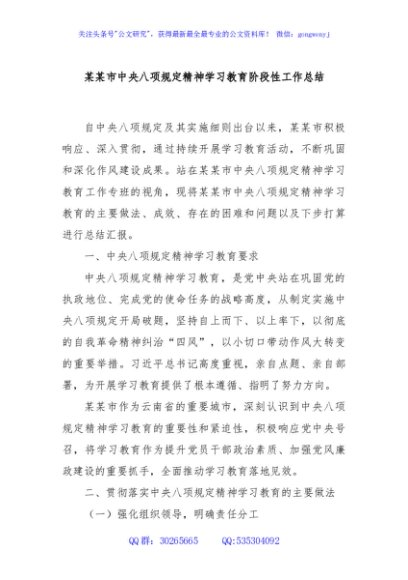 某某市中央八项规定精神学习教育阶段性工作总结