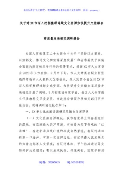 / 关于对XX市深入挖掘整理地域文化资源加快提升文旅融合高质量发展情况调研报告