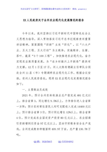 / XX人民政府关于全州农业现代化发展情况的报告