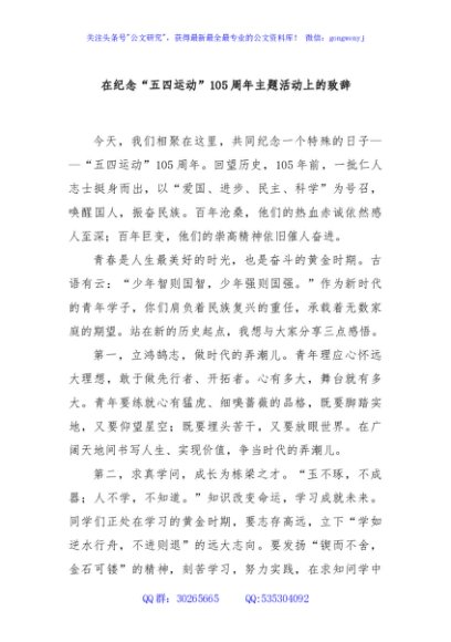 / 在纪念“五四运动”105周年主题活动上的致辞