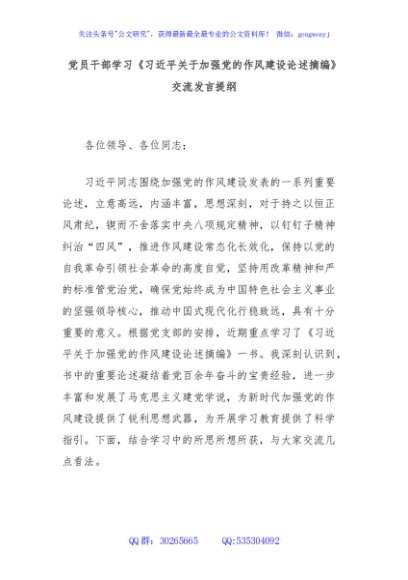 党员干部学习《习近平关于加强党的作风建设论述摘编》交流发言提纲
