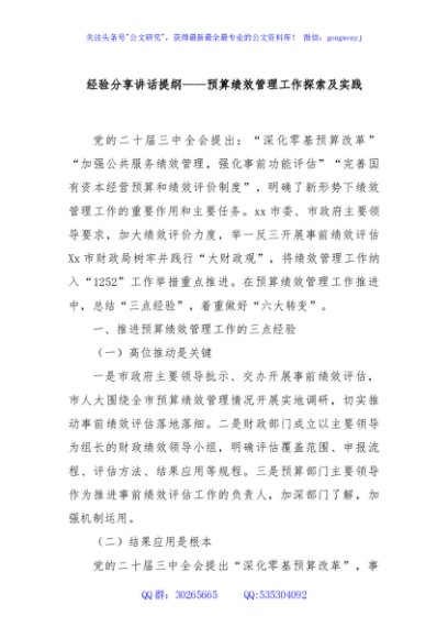 经验分享讲话提纲——预算绩效管理工作探索及实践