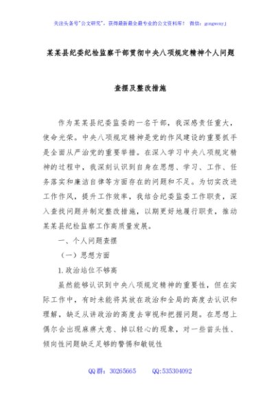 / 某某县纪委纪检监察干部贯彻中央八项规定精神个人问题查摆及整改措施