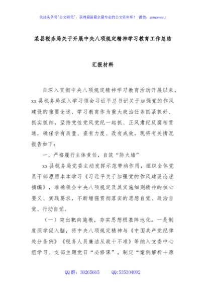 / 某县税务局关于开展中央八项规定精神学习教育工作总结汇报材料
