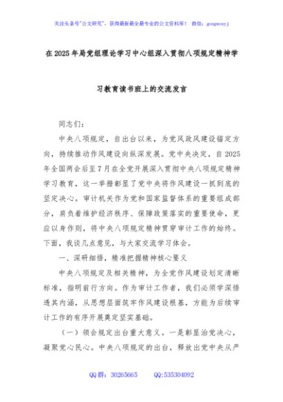 / 在2025年局党组理论学习中心组深入贯彻八项规定精神学习教育读书班上的交流发言