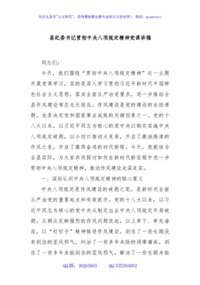 / 县纪委书记贯彻中央八项规定精神党课讲稿