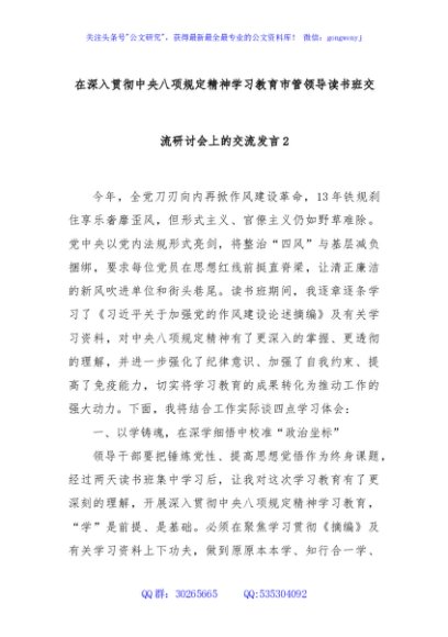 / 在深入贯彻中央八项规定精神学习教育市管领导读书班交流研讨会上的交流发言2