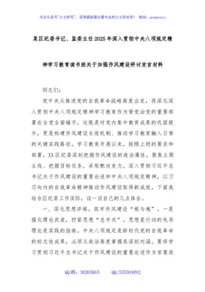 / 某区纪委书记、监委主任2025年深入贯彻中央八项规定精神学习教育读书班关于加强作风建设研讨发言材料