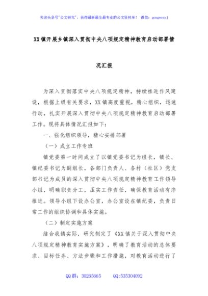 / XX镇开展乡镇深入贯彻中央八项规定精神教育启动部署情况汇报