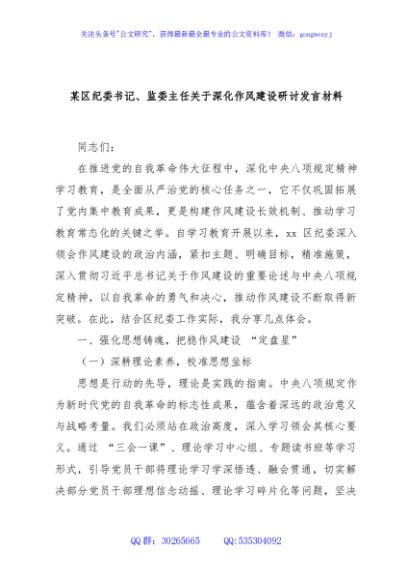 / 某区纪委书记、监委主任关于深化作风建设研讨发言材料