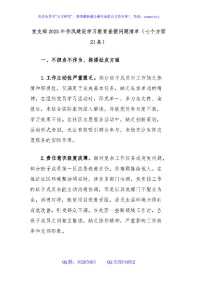 / 党支部2025年作风建设学习教育查摆问题清单(七个方面21条)