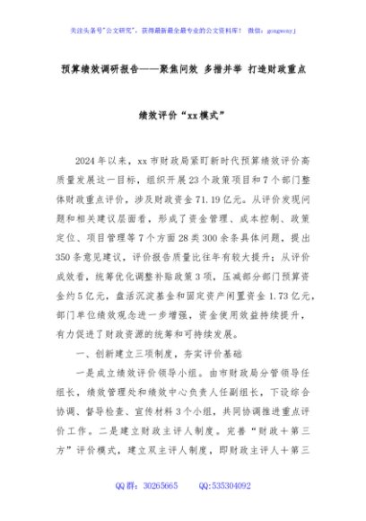 / 预算绩效调研报告——聚焦问效 多措并举 打造财政重点绩效评价“xx模式”