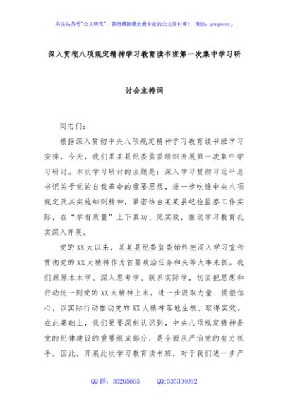 / 深入贯彻八项规定精神学习教育读书班第一次集中学习研讨会主持词