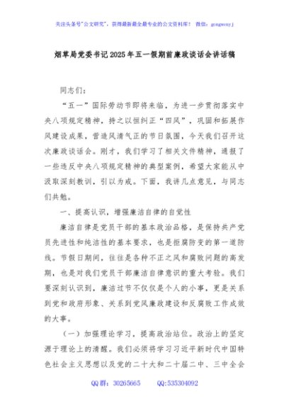 / 烟草局党委书记2025年五一假期前廉政谈话会讲话稿