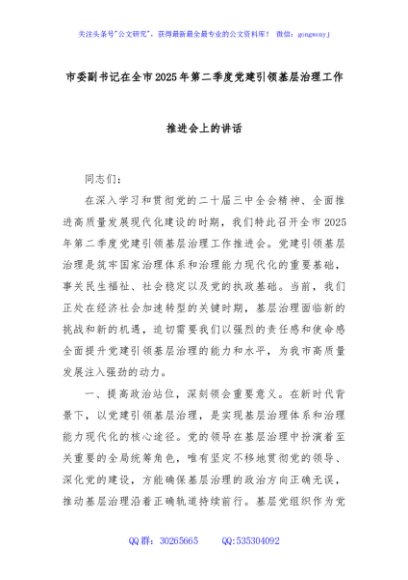 / 市委副书记在全市2025年第二季度党建引领基层治理工作推进会上的讲话