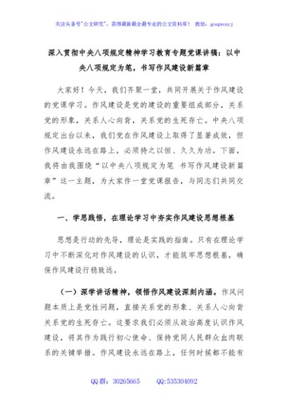 / 深入贯彻中央八项规定精神学习教育专题党课讲稿:以中央八项规定为笔,书写作风建设新篇章