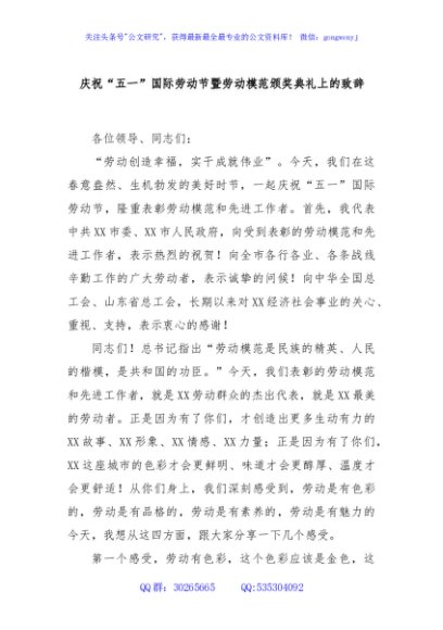 / 庆祝“五一”国际劳动节暨劳动模范颁奖典礼上的致辞