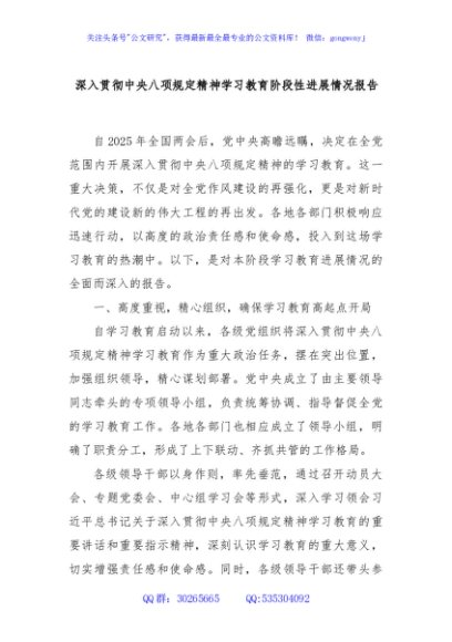 / 深入贯彻中央八项规定精神学习教育阶段性进展情况报告