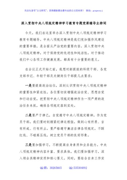 / 深入贯彻中央八项规定精神学习教育专题党课辅导主持词