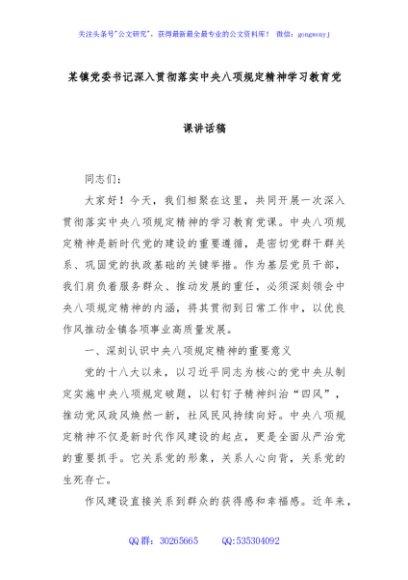 / 某镇党委书记深入贯彻落实中央八项规定精神学习教育党课讲话稿