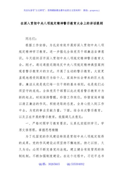 / 在深入贯彻中央八项规定精神警示教育大会上的讲话提纲