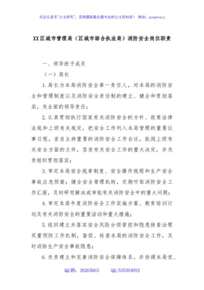 / XX区城市管理局(区城市综合执法局)消防安全岗位职责