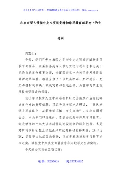 / 在全市深入贯彻中央八项规定精神学习教育部署会上的主持词