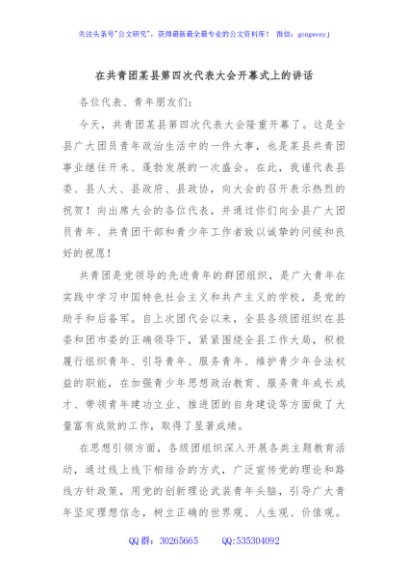 / 在共青团某县第四次代表大会开幕式上的讲话