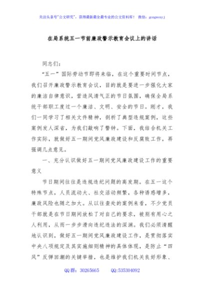 / 在局系统五一节前廉政警示教育会议上的讲话