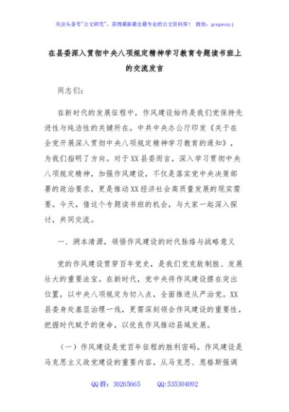 / 在县委深入贯彻中央八项规定精神学习教育专题读书班上的交流发言