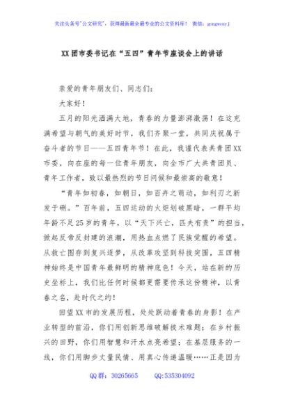 / XX团市委书记在“五四”青年节座谈会上的讲话