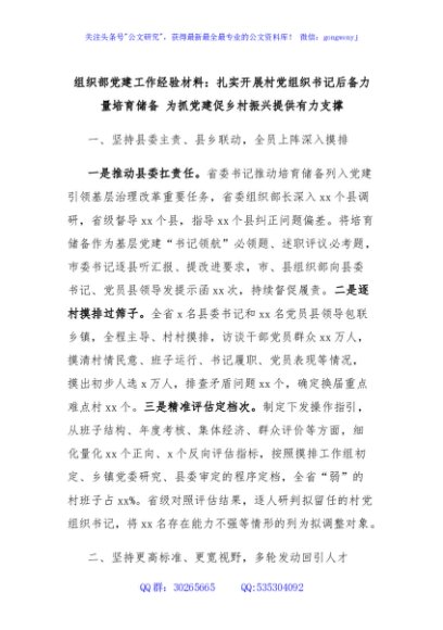 / 组织部党建工作经验材料:扎实开展村党组织书记后备力量培育储备 为抓党建促乡村振兴提供有力支撑
